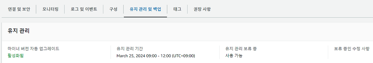 AWS 콘솔에서 RDS DB 인스턴스를 살펴보면 '유지 관리 및 백업'이라는 항목이 있습니다.