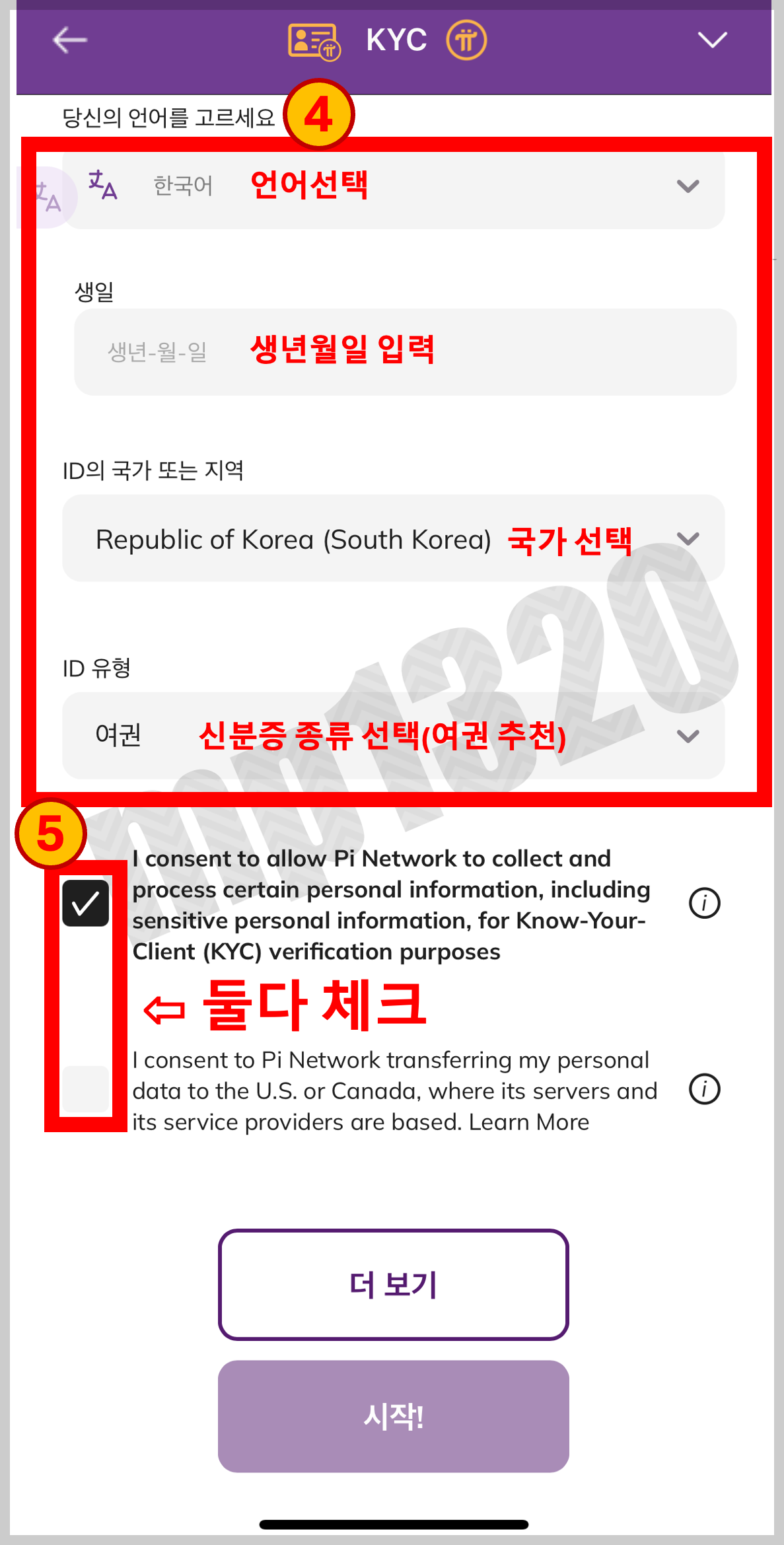 4. 언어선택, 생년월일, 국가선택, 신분증 선택