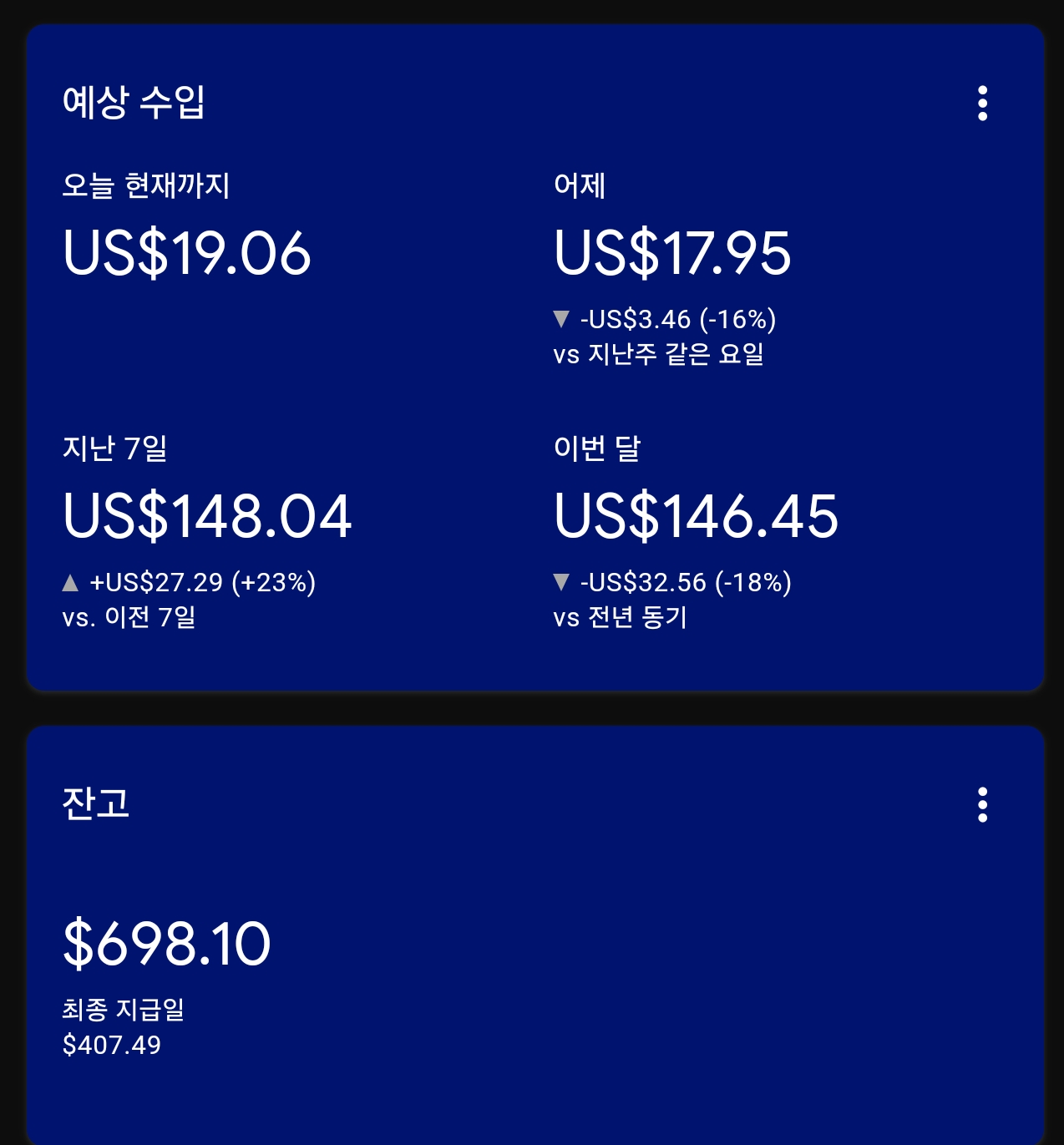 | [청담점 오픈 / 애드센스 건물주 - 3월 월세] US $459 돌파 - AdSense 3/23일!! (7) | 2025.03.24 |