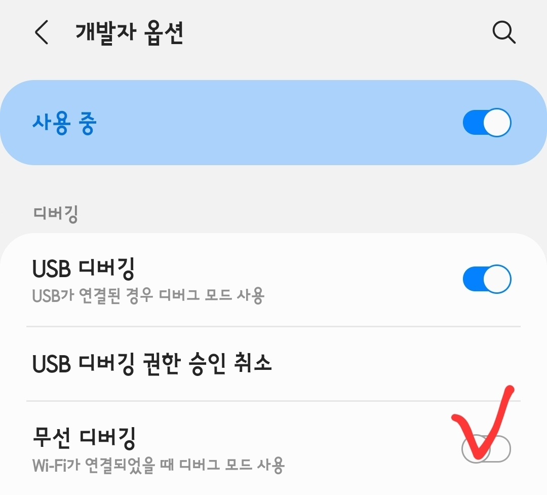 둘째는 개발자 옵션 활성화입니다. 유선 연결이든 무선 연결이든 개발자 모드 활성화는 필수입니다.