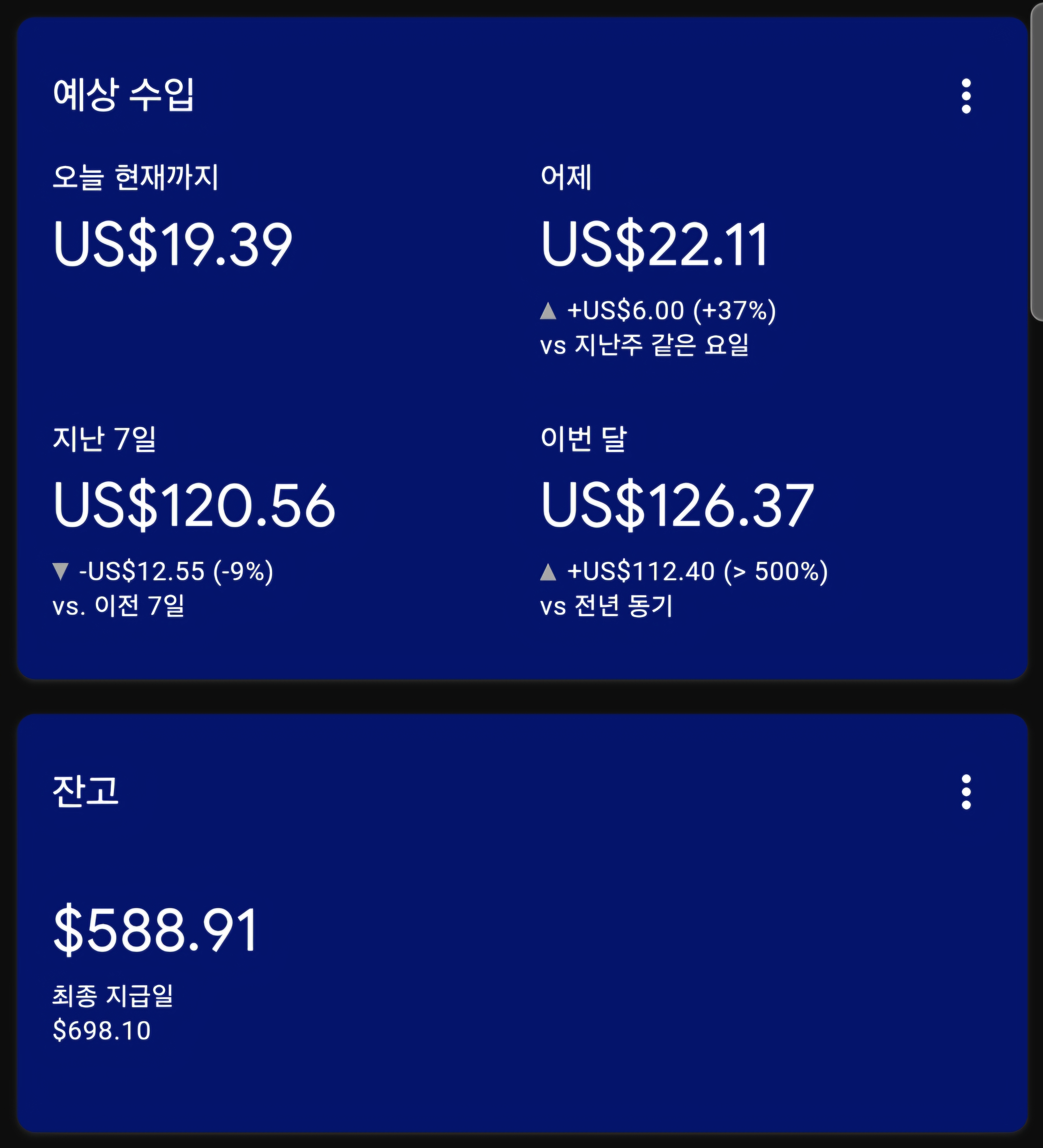 | [청담점 오픈 / 애드센스 건물주 - 3월 월세] US $459 돌파 - AdSense 3/23일!! (7) | 2025.03.24 |