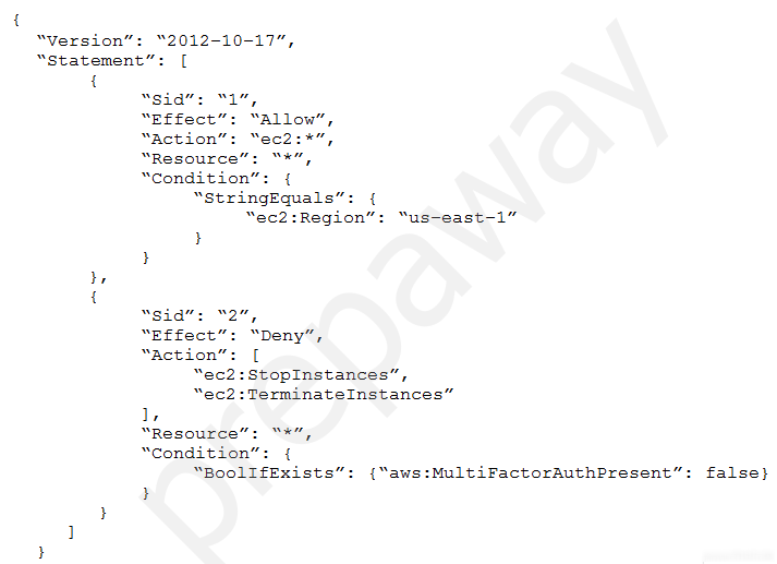 - D. Group members are allowed the ec2:StopInstances and ec2:TerminateInstances permissions for the us-east-1 Region only when logged in with multi-factor authentication (MFA). Group members are permitted any other Amazon EC2 action within the us-east-1 Region.