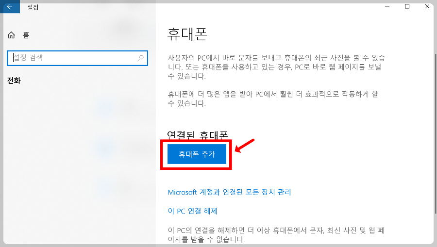 먼저 바탕화면에서 [시작] 버튼 클릭 → [설정] → [전화] → [휴대폰 추가]를 차례로 클릭해 주세요.