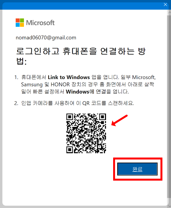 [Windows와 연결 앱이 준비되었습니다.] 항목에 체크하면, 하단의 [QR 코드를 사용하여 연결] 버튼이 활성화 됩니다.