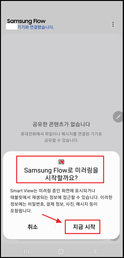 ② 스마트폰의 삼성플로우 화면에 보면, "미러링을 시작할까요?"라는 멘트가 나오면 "지금 시작"을 클릭하세요!