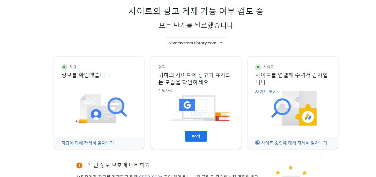 - 애드센스에서 사이트 검토가 완료되었는지 확인하세요.
