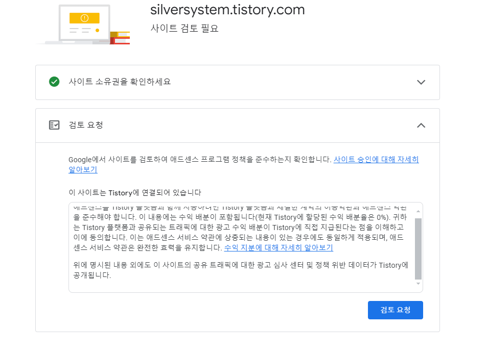 - 추가한 티스토리 블로그 옆의 '검토 요청' 버튼을 클릭합니다.