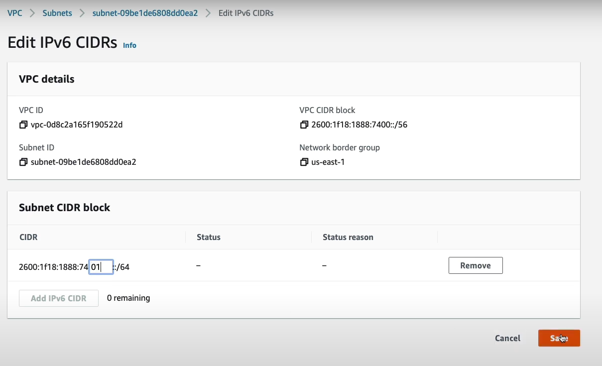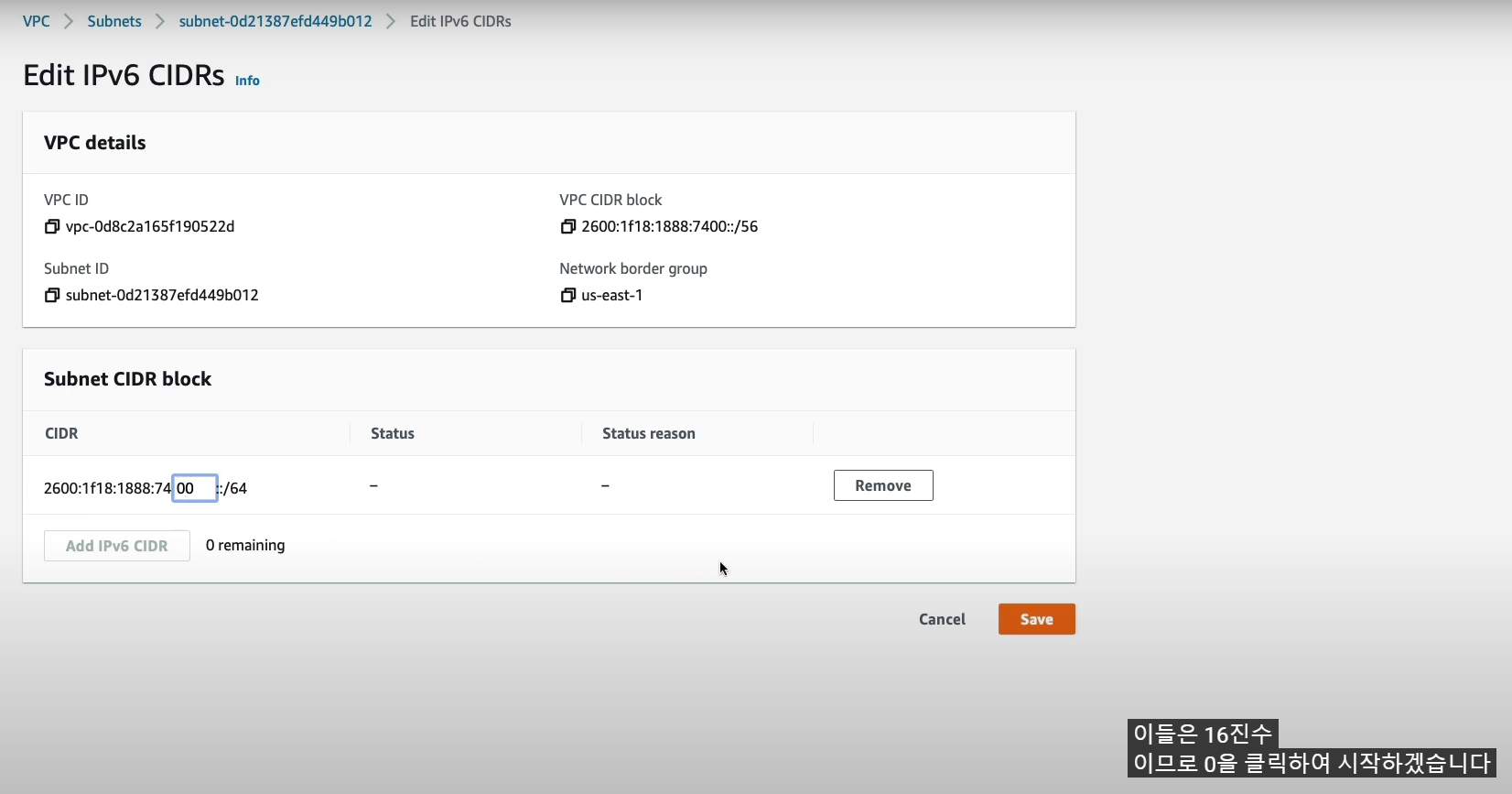 - Public-1b 활성화 : Edit IPv6 CIDRs