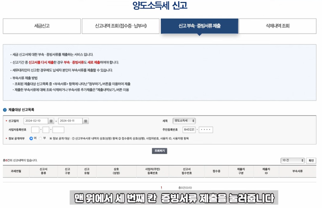 - 홈택스 로그인 > 양도소득세 예정신고 > ‘신고부속서류 제출’