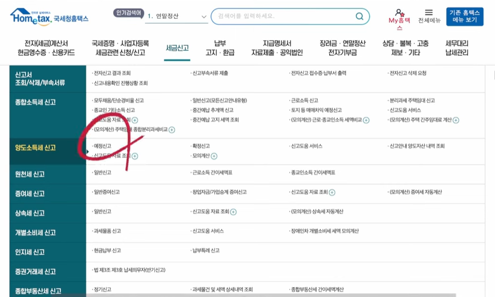 2. 양도소득세 신고 ==> 예정신고 클릭