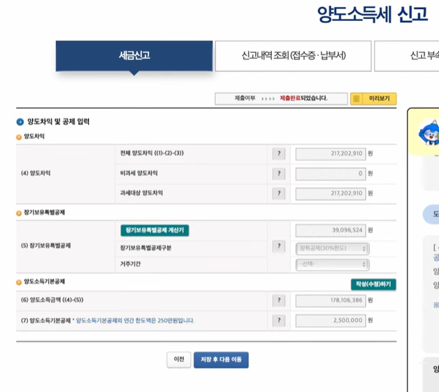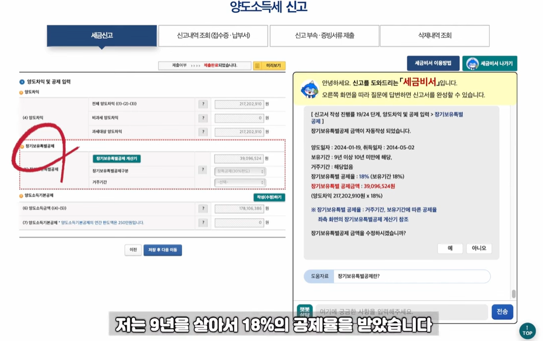 8. 양도차익 확인 (9년 살아서 18% 공제)