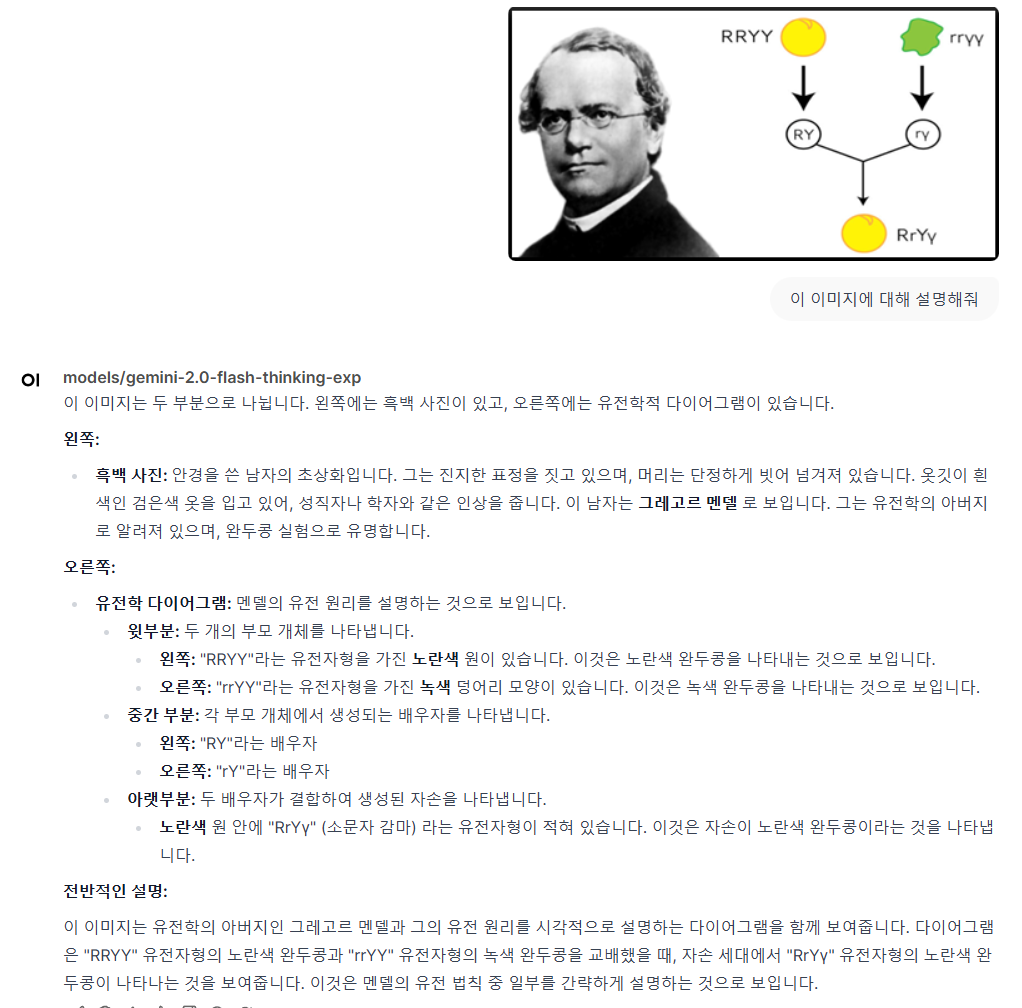 gemini 2.0 flash thinking에 멘델의 유전법칙을 입력해 보았다.
