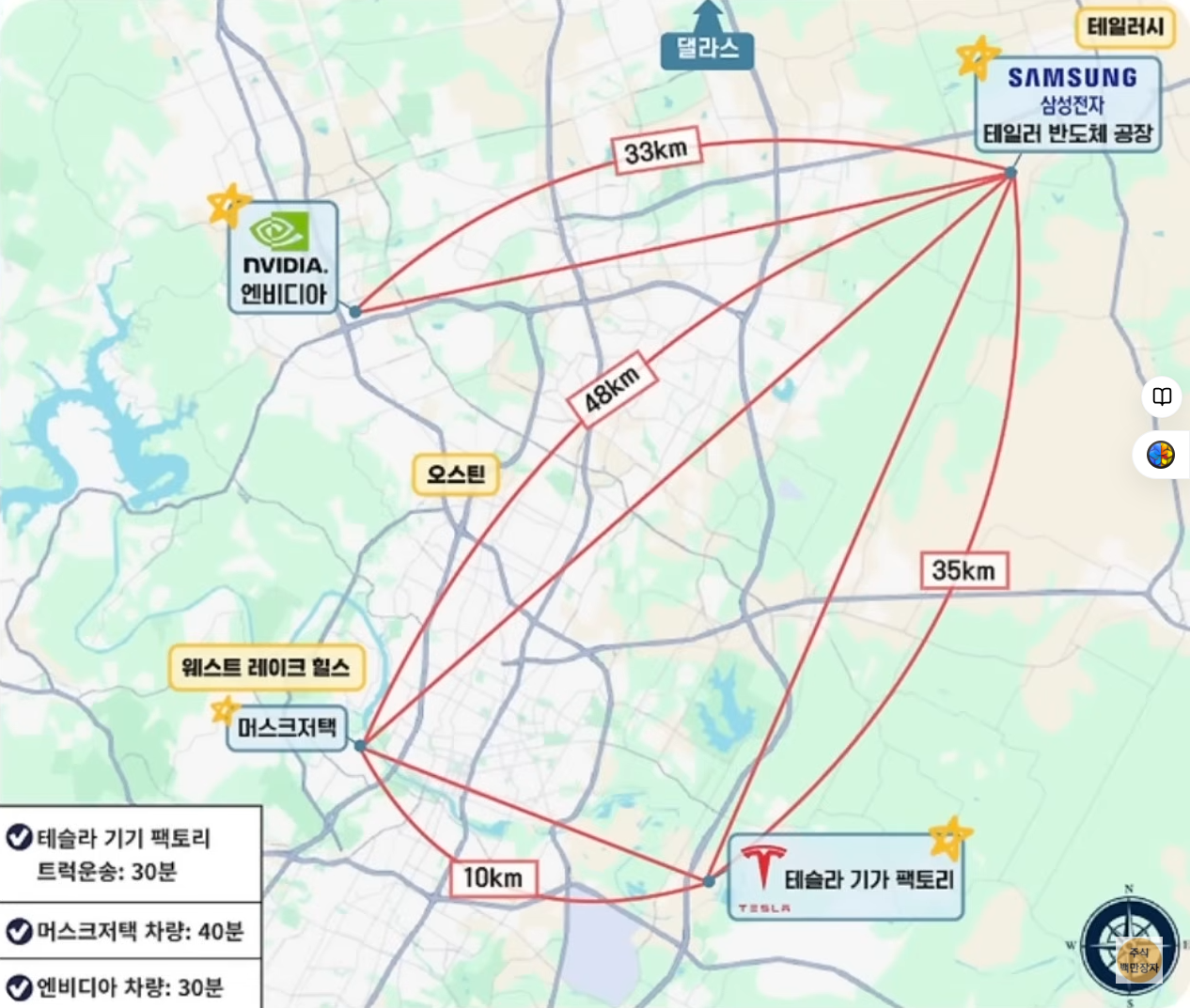 - 삼성 테일러 공장과 엔비디아의 달라스 AI 인프라 간 거리는 100km 이내로 추산되며, 이는 물류 최적화 및 공급망 협력에 유리한 조건입니다.