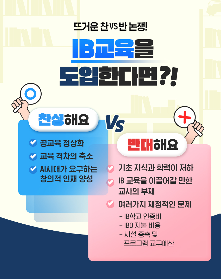 최근 한국에서도 일부 초·중·고등학교에서 IB를 도입하거나 시범 운영하고 있습니다.