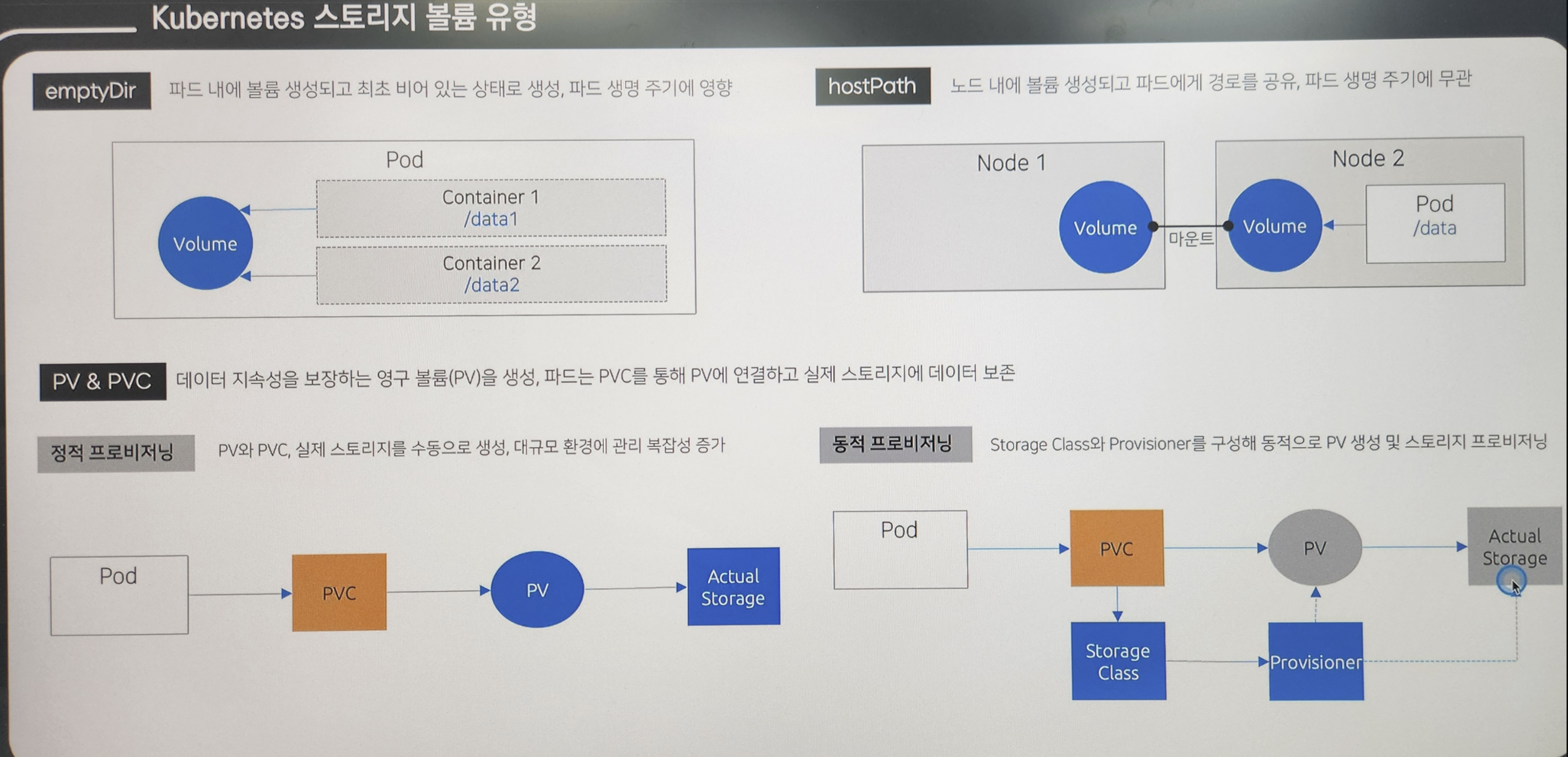 | Ephemeral (임시 스토리지) | Pod 생명주기 동안만 유지됨 | emptyDir, configMap, secret, downwardAPI |