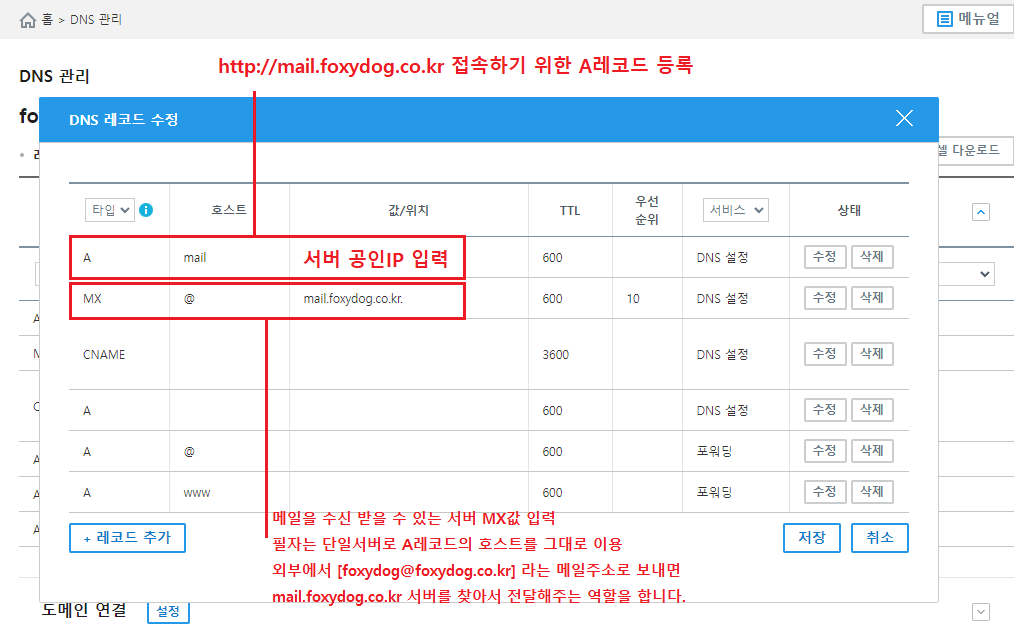 ※ 수발신을 위한 A/MX 레코드 등록 필요 [서버를 찾아갈 수 있게 mail.foxydog.co.kr DNS에 호스트를 등록]