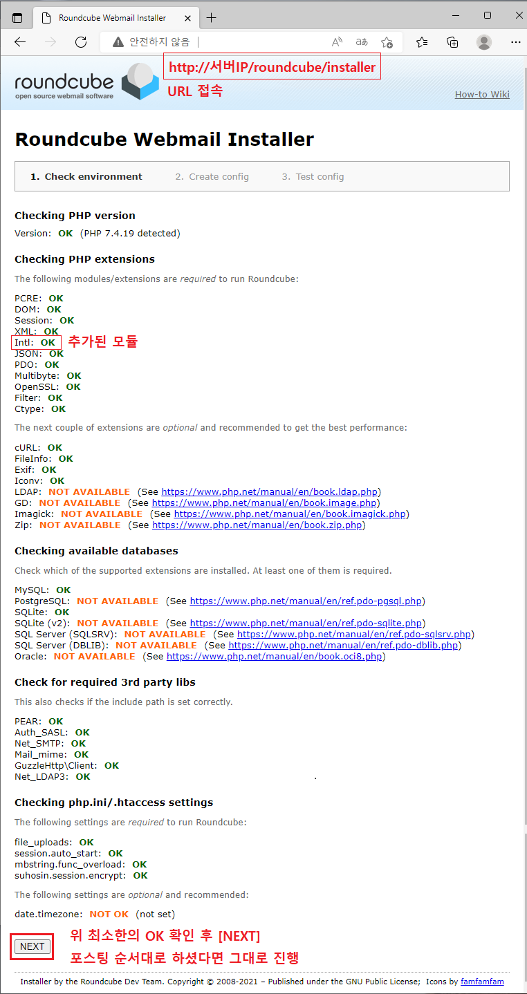※ RoundCube에서 php-intl 추가로 설치되어야 진행이 가능합니다.