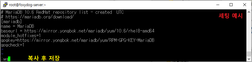 gpgkey=https://mirror.yongbok.net/mariadb/yum/RPM-GPG-KEY-MariaDB