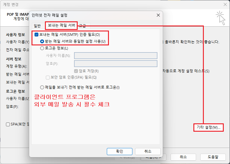 ※ 추가로 외부로 메일 발송하기 위해서는 아웃룩에서 꼭 [보내는 메일 서버(SMTP) 인증 필요] 체크가 되어 있어야 합니다. 필수!