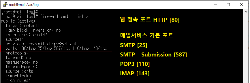 [root@localhost ~]# firewall-cmd --permanent --add-port=80/tcp --add-port=25/tcp --add-port=587/tcp --add-port=110/tcp --add-port=143/tcp [전체 한 줄]