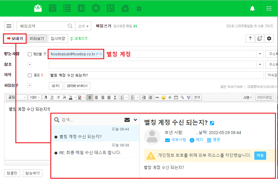 ※ foxydogsub@foxydog.co.kr 계정은 별칭 계정으로 메일 박스가 있는 계정이 아닙니다. 하지만 해당 계정으로 수신 받을 시 메일 박스가 있는 foxydog@foxydog.co.kr 라는 계정으로 전달을 합니다.