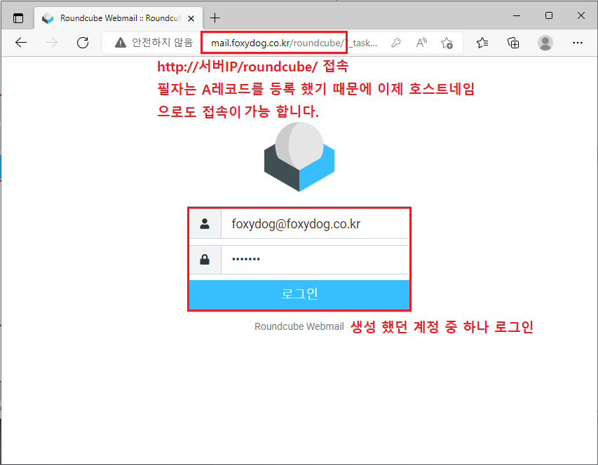 ※ http://서버IP/roundcube/ 접속