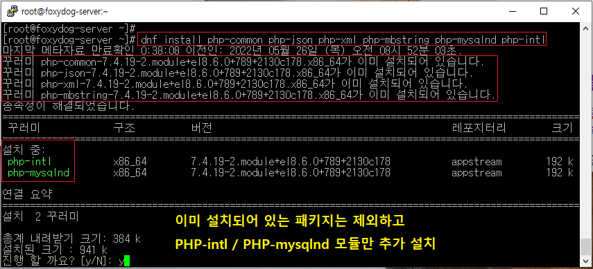 [root@localhost ~]# dnf install php-common php-json php-xml php-mbstring php-mysqlnd php-intl [추가 php모듈 설치]
