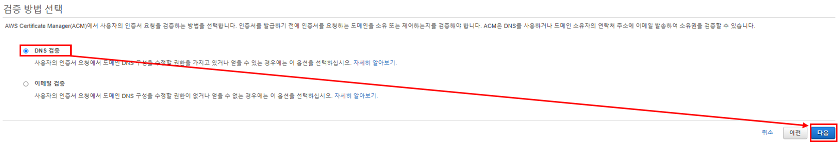 DNS 검증이 더 수월하므로 DNS 검증을 선택한다.