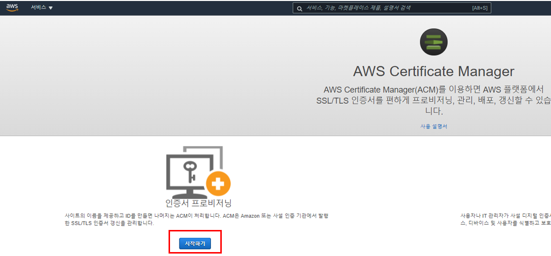 ACM(Amazon Certificate Manager)에서 인증서 프로비저닝 시작하기를 클릭한다.