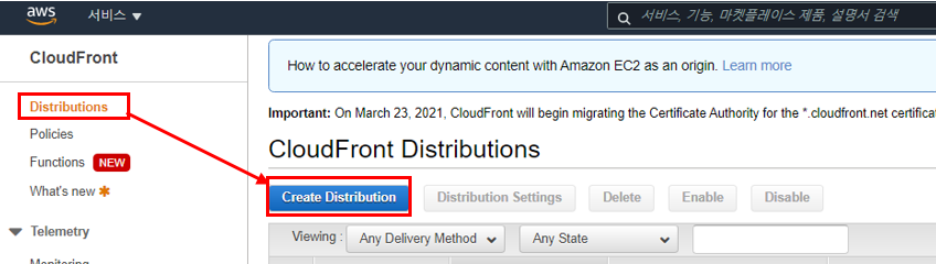 CloudFront 메인 콘솔로 넘어가서 Distribution을 생성한다.