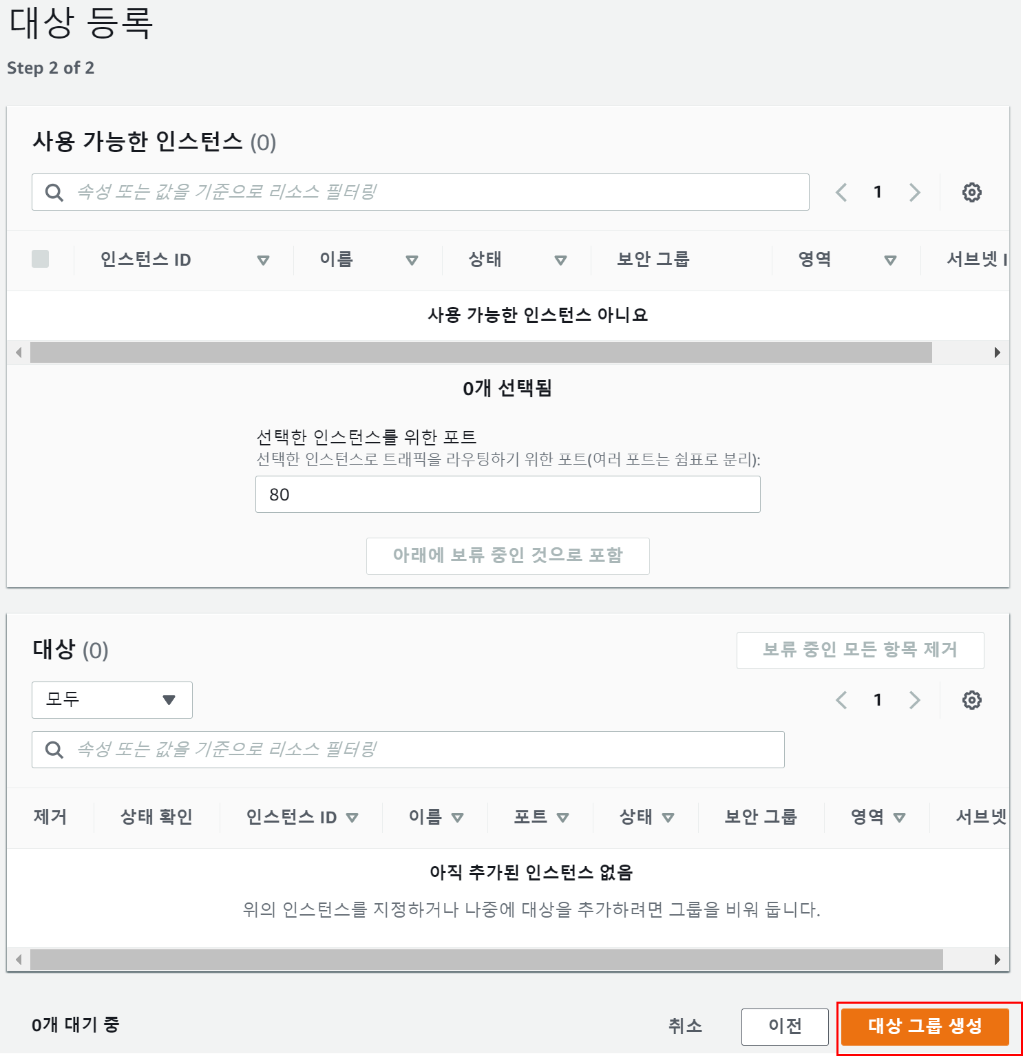 아직 등록할 대상이 없으므로 등록하지 않고 Target group을 생성한다.