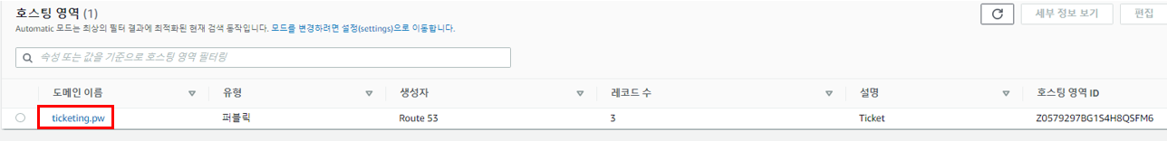 ticketing.pw가 호스팅 영역으로 생성되었다. 생성된 도메인을 클릭한다.