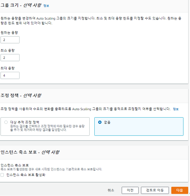 원하는 인스턴스 용량을 지정한다. 조정 정책은 지금은 없음으로 지정하고 이후에 단순 조정 정책을 따로 지정할 것이다.