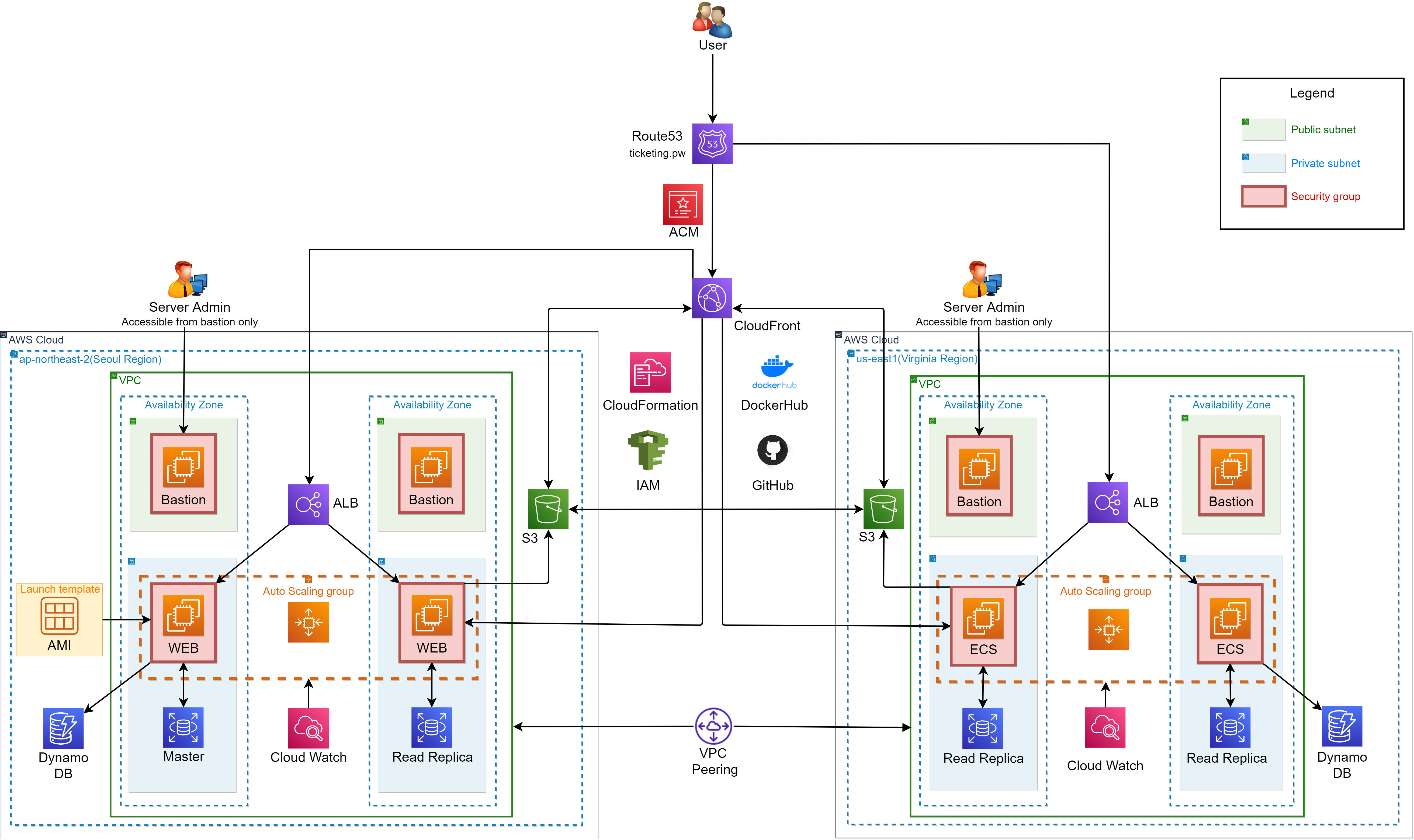 - 서울리전 장애 발생시: Route53 HealthCheck이 서울리전의 비정상을 감지하고 Route53의 Failover 정책에 따라 클라이언트가 ticketing.pw로 접속을 시도하면 버지니아의 ELB로 라우팅 되어 WEB서버로 접속된다.