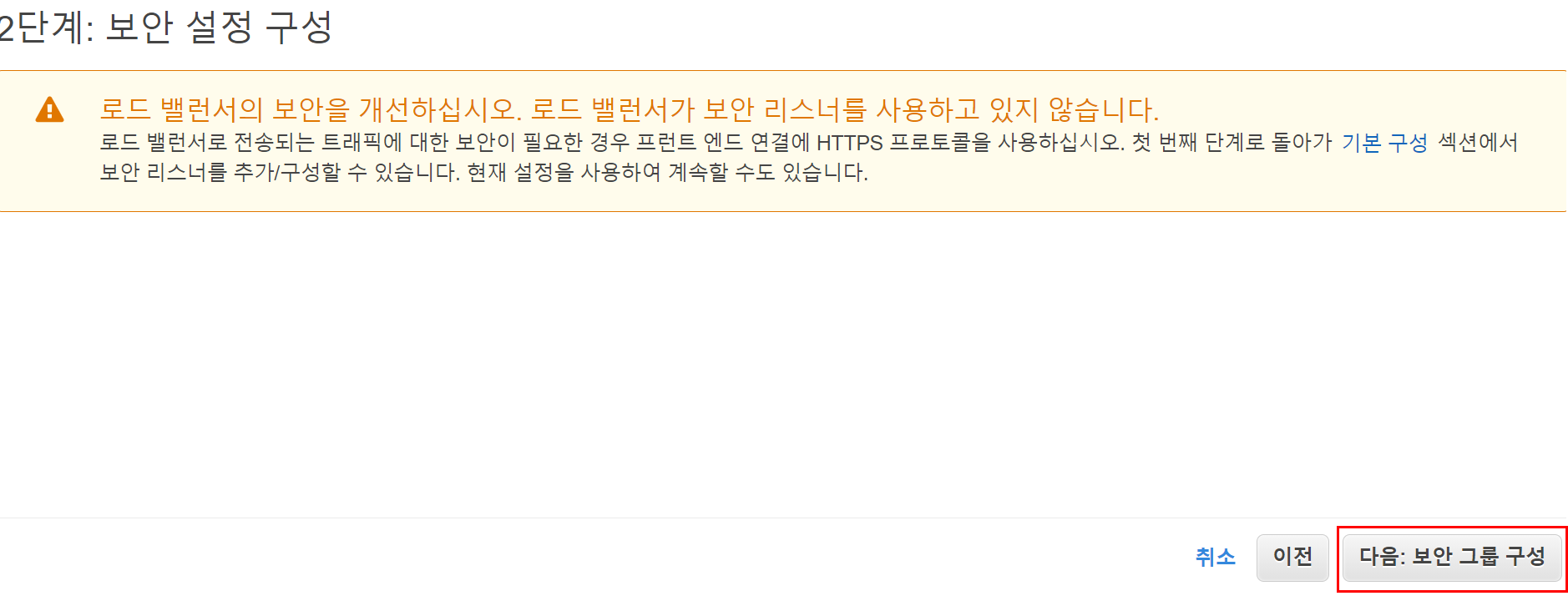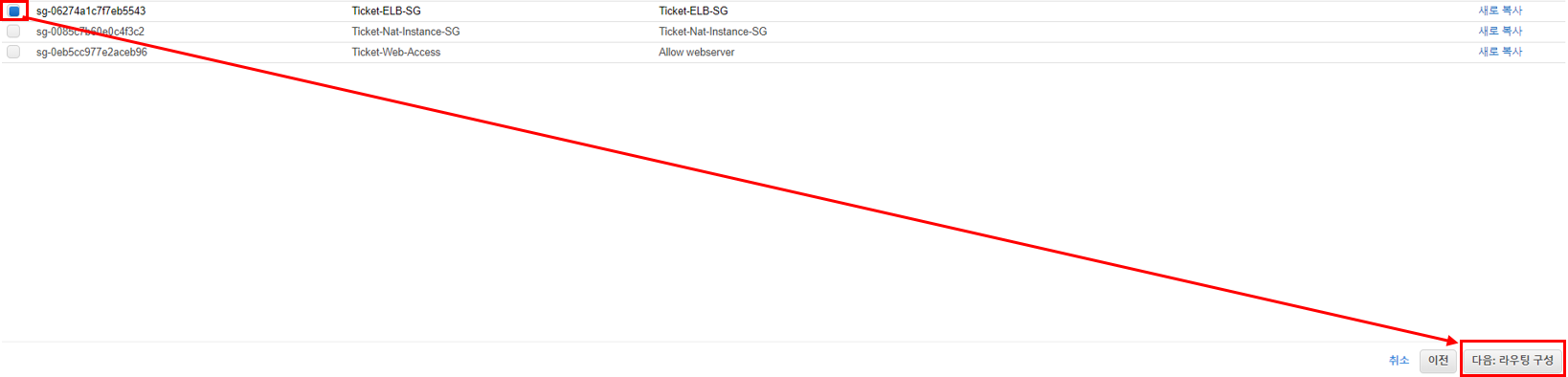 미리 생성했던 ELB의 보안 그룹을 선택하고 다음으로 넘어간다.