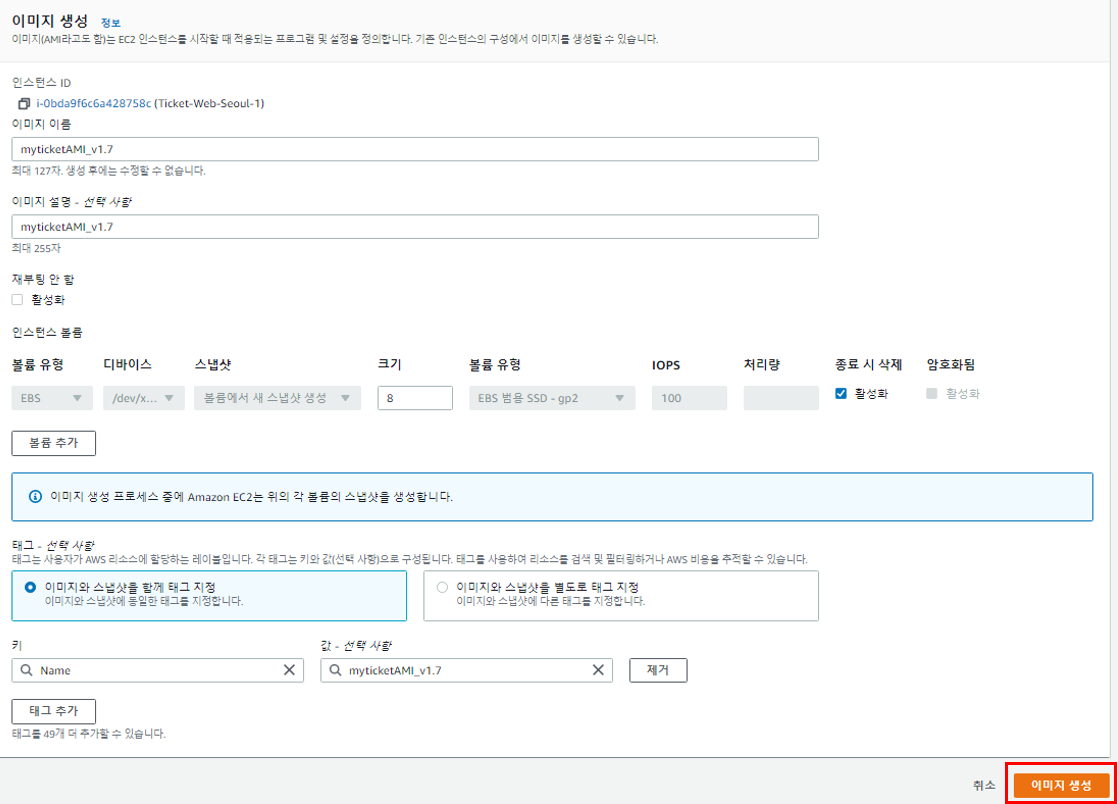 원하는 이미지 이름과 설명 및 태그를 추가하고 이미지를 생성한다.