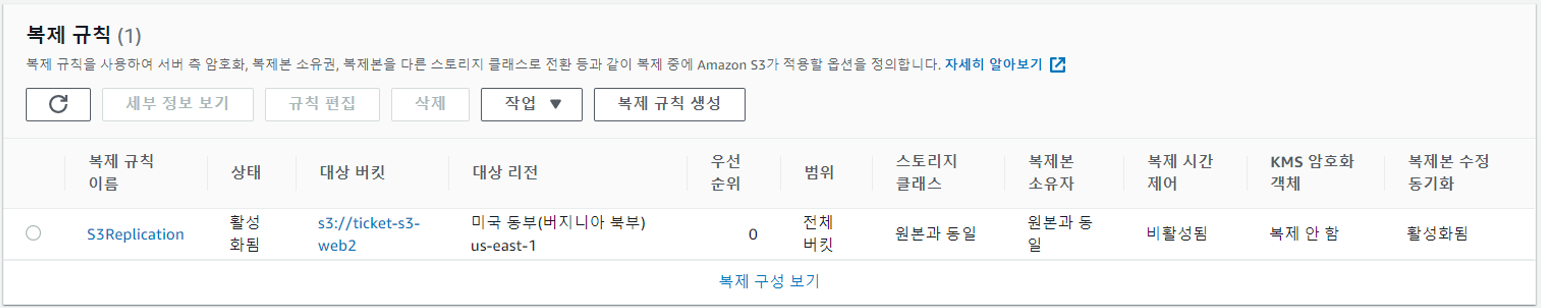 복제 규칙이 생성되었으며 서울 리전 버킷에 존재하는 데이터가 버지니아로 자동으로 복제 및 동기화 된다.