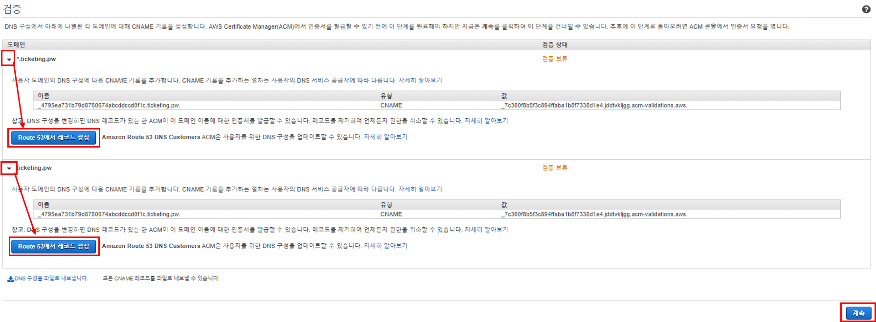 (클릭을 해야 DNS 검증이 시작됨)