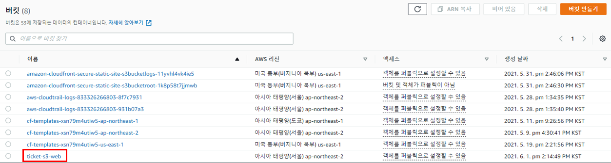 생성한 S3를 선택하고 반드시 ticket-s3-web.ap-northeast-2.amazonaws.com로 Domain Name을 Regional Domain Name으로 바꿔줘야 정상적으로 잘 작동한다.