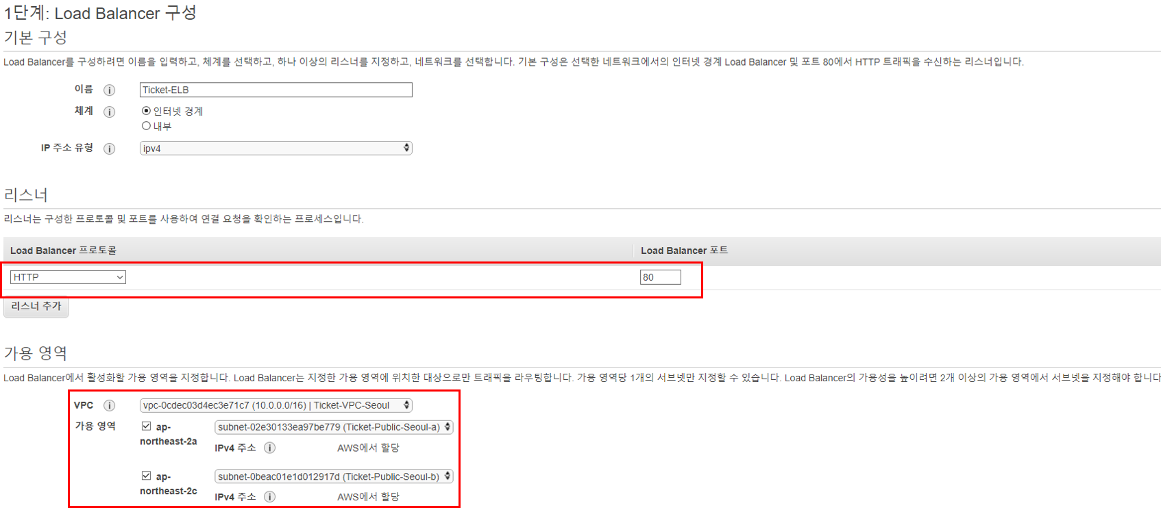 서울 리전 ELB는 CloudFront와 HTTP 통신할 것이기 때문에 리스너는 HTTP로 설정한다. 체계는 인터넷 경계로 설정하고 가용 영역은 반드시 Public 서브넷으로 선택한다.