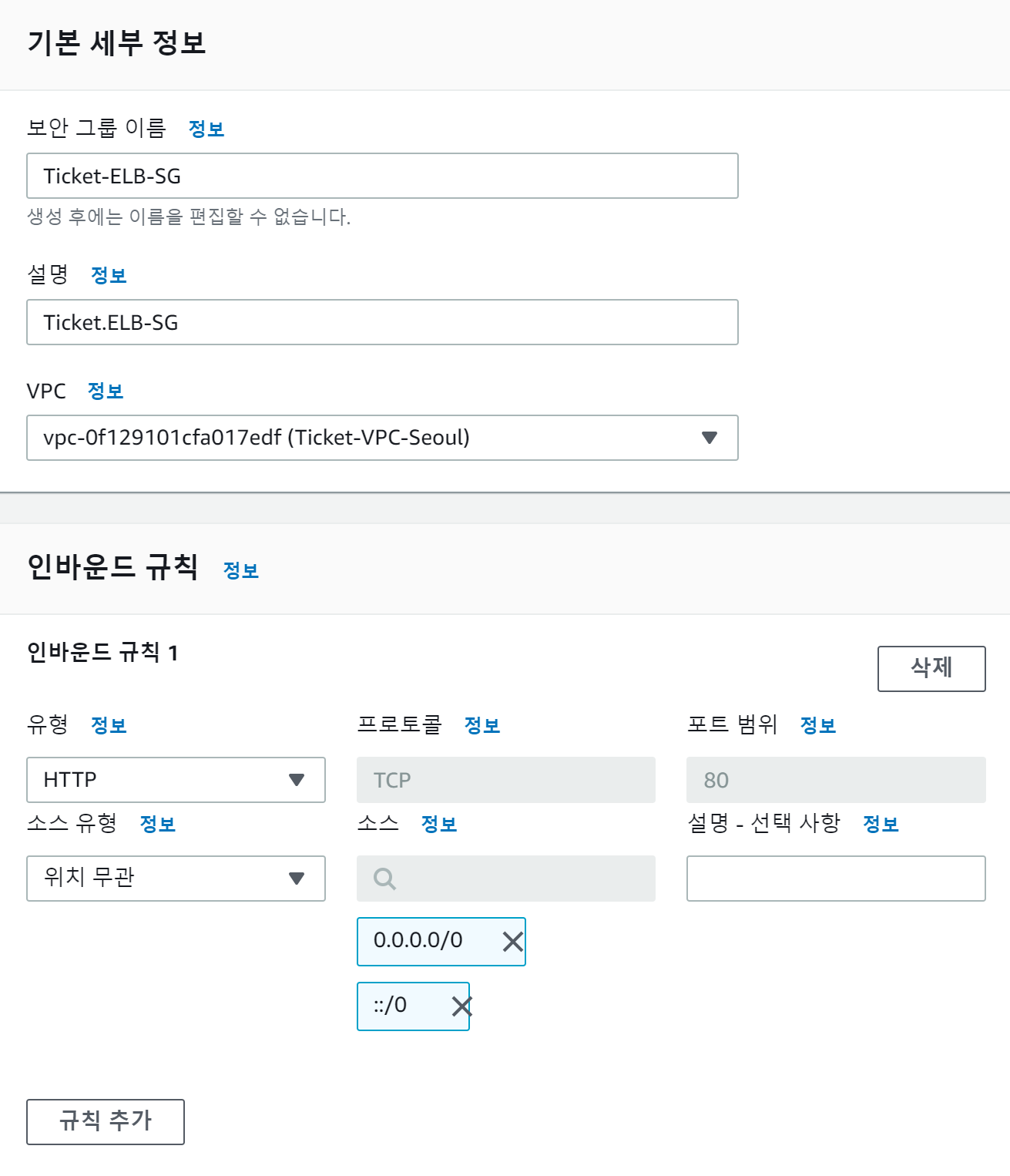 HTTP에 대하여 위치에 관계없이 접근 가능하도록 ELB의 보안 그룹을 생성한다.