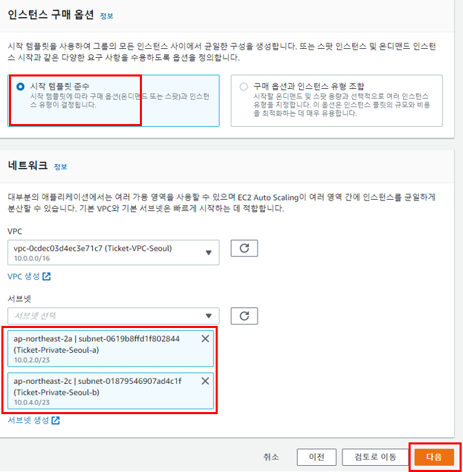 템플릿을 참조하여 EC2를 생성하기 때문에 기존에 생성한 템플릿을 지정하고 다음으로 넘어간다.