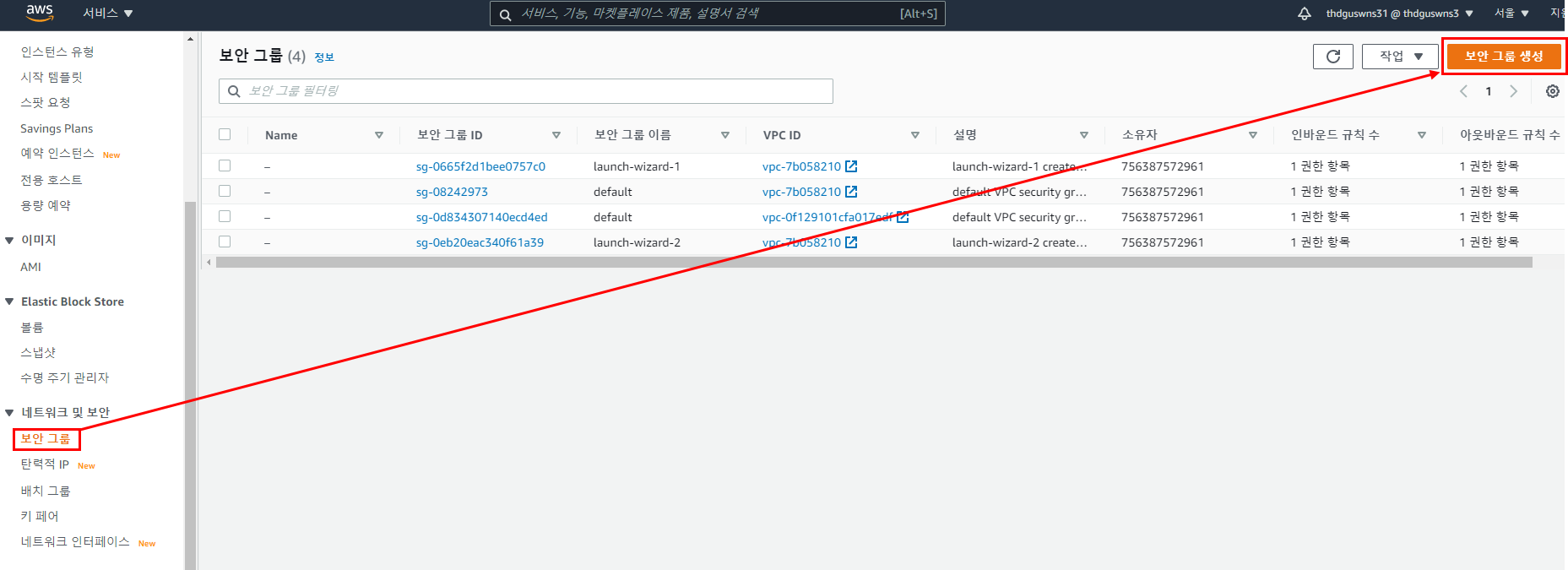 EC2 콘솔에서 다음과 같이 클릭한다.