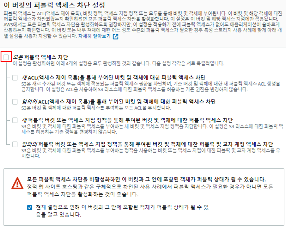 퍼블릭 엑세스 차단을 풀어준다. (차단시 테스트 필요)