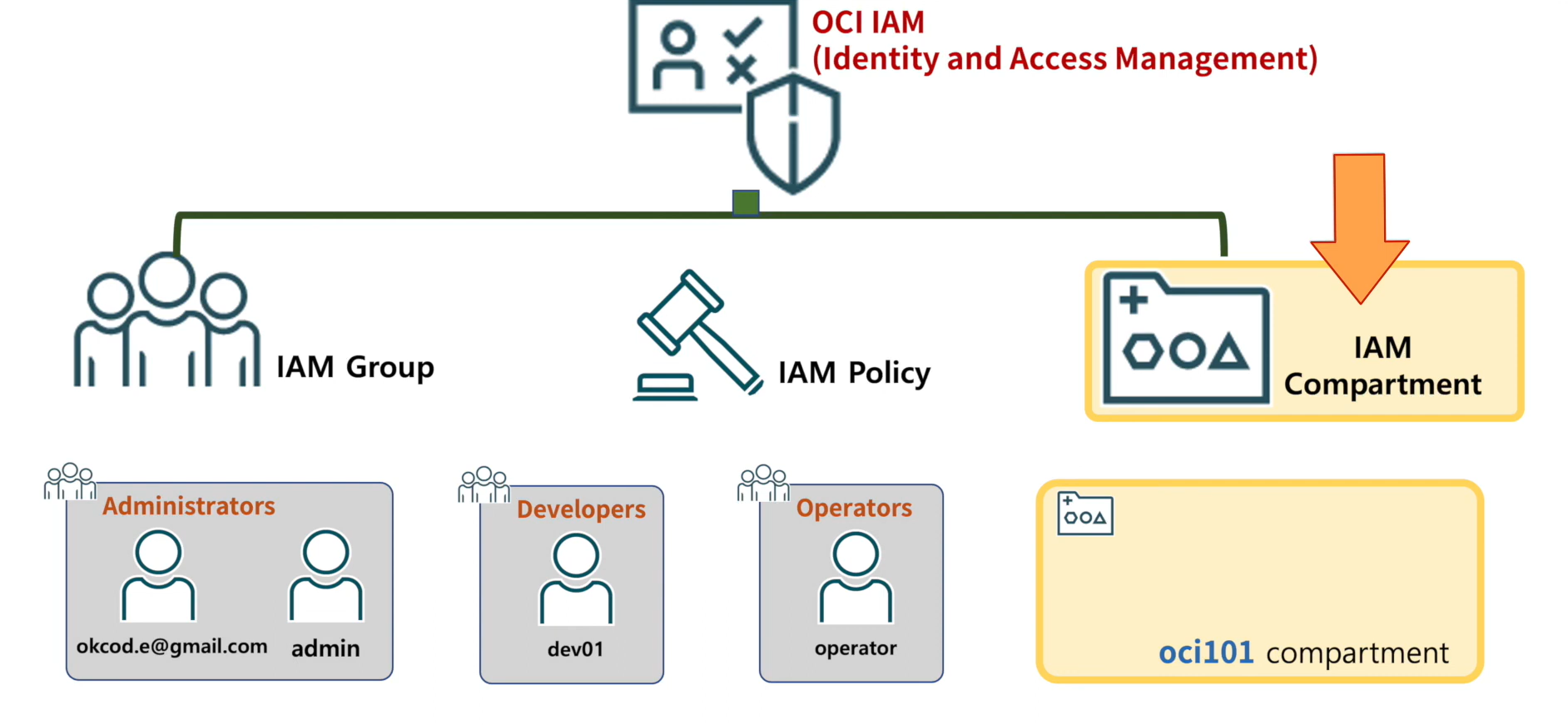 - OCI IAM의 역할: 클라우드 자원에 대한 접근 제어를 설정하기 위해 IAM (Identity and Access Management)을 사용함