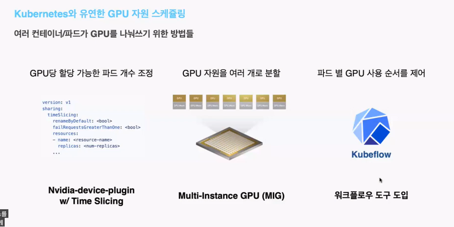 - 여러 컨테이너/파드가 GPU를 나눠쓰기 위한 방법들