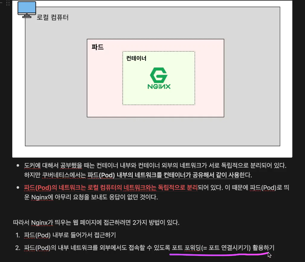 ## 파드의 네트워크는 로컬 컴퓨터의 네투워크와는 독립적으로 분리되어 있다.