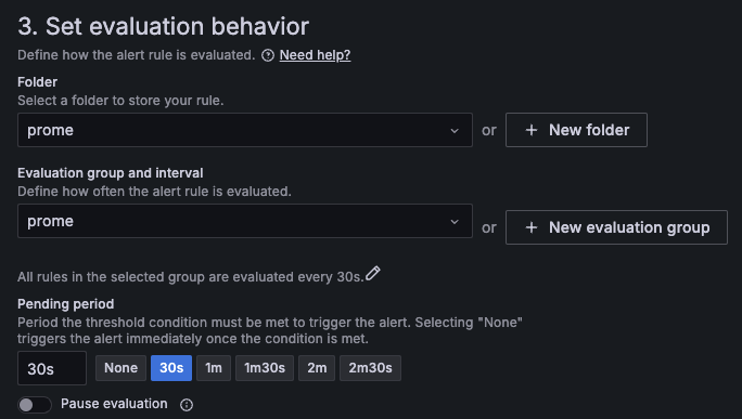 pending period, Evaluation internal 은 빠른 확인을 위해 30s으로 설정합니다.