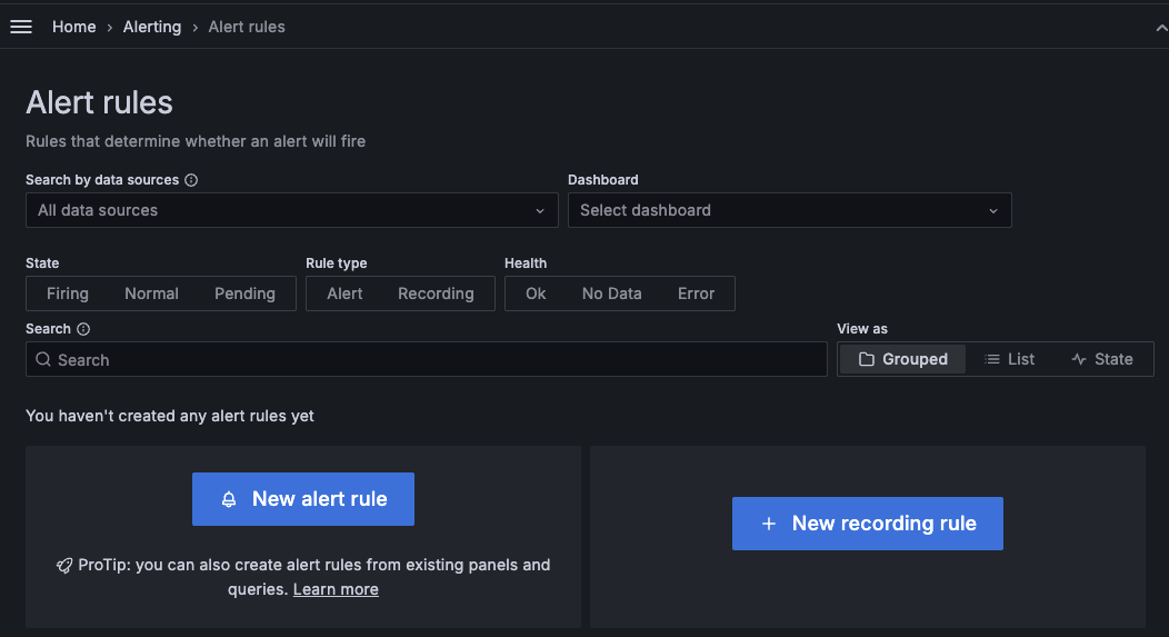 Home > Alerting > Alert rules로 들어가서 [New alert rule]을 클릭하여 새로운 알람 룰을 생성해줍니다.