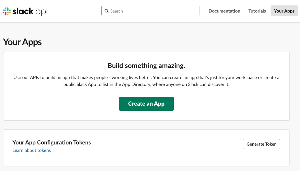 https://api.slack.com/apps에 접속하고, 먼저 Your Apps를 들어가서 Create an App을 클릭하여 앱을 만들어줍니다.
